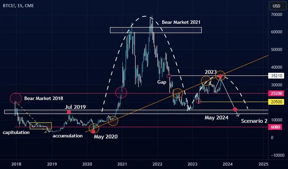Aplicando chartismo encontramos la formación de taza con asa invertida, y este era nuestro segundo escenario aplicado para un mercado bajista considerado como “el peor de los escenarios”, puesto que se perfora la tendencia alcista principal que se ha venido formando desde 2017.