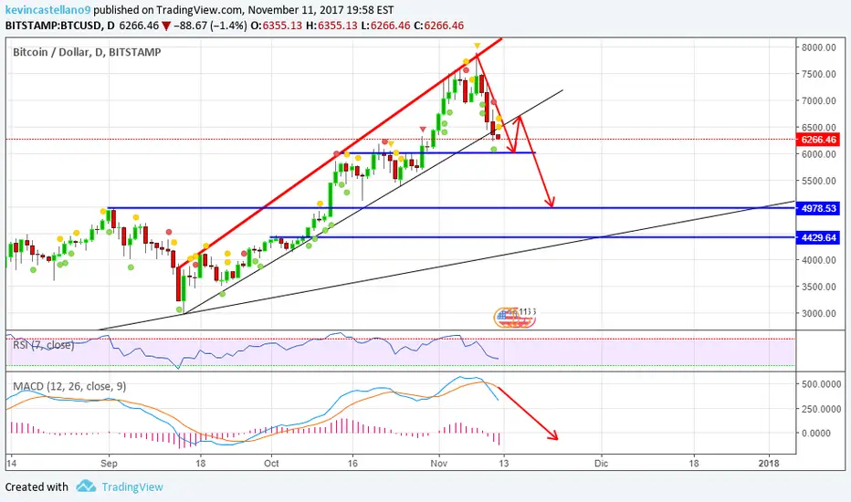 BTCUSD ha roto la linea de tendencia alcista y está corrigiendo bastante fuerte, encontramos el primer soporte en 6000 y el soporte fundamental en 5000, donde el precio debería rebotar.