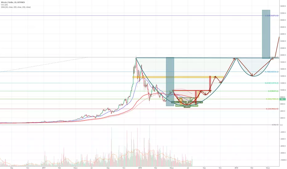 4. Formación azul. Taza con asa. Esta formación de largo plazo se esta gestando desde inicios del 2018 y durará hasta finales del 2018. Con un posible retroceso del asa hasta el 78% fibo histórico. Objetivo 32000$ a mitad del 2019. Este objectivo seria la proyección del 1.618 de todo el historico.