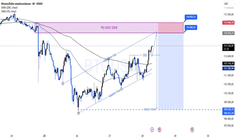 Este gráfico de BTC/USD en 30 minutos muestra el precio subiendo dentro de un canal ascendente hacia una zona de oferta (114,201 – 114,940 USD). El mercado respeta tanto la línea de soporte como la línea de rechazo, mientras cotiza por encima de la EMA 70 (111,733) y la EMA 200 (112,102), lo que indica un impulso alcista en el corto plazo.