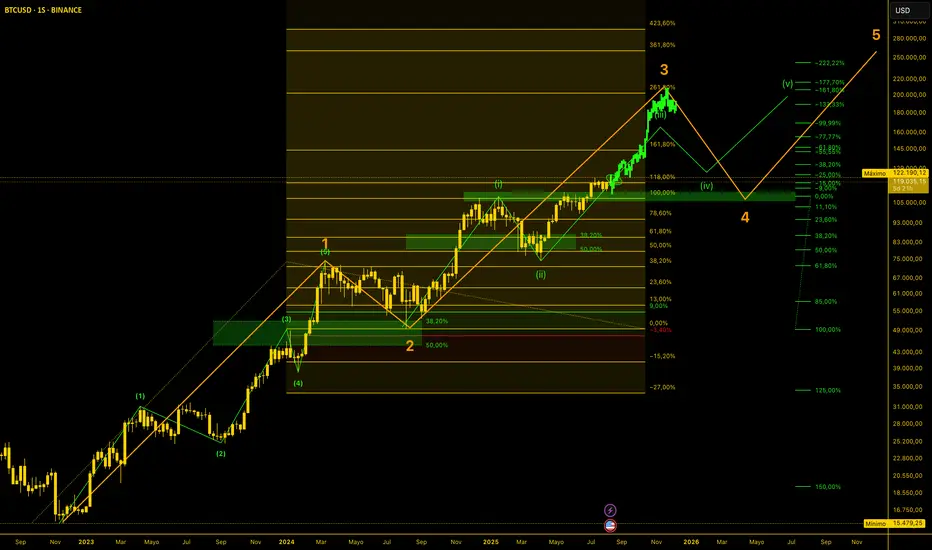 • Se espera una corrección natural (Onda 4) hacia la zona entre $100,000–$105,000.