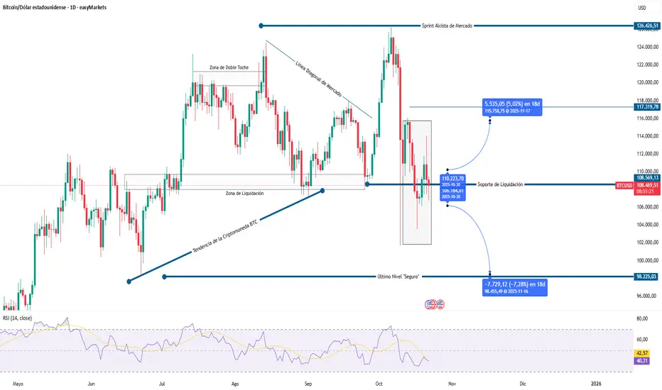 BTCUSD parece haber entrado en una fase de consolidación, manteniéndose estable cerca de su soporte clave en 108,569. Después de la fuerte volatilidad generada por los anuncios arancelarios de Donald Trump, el activo finalmente muestra señales de descanso, preparando terreno para un nuevo movimiento direccional.