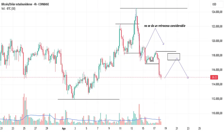 venimos siguiendo el movimiento alcista fractal que llevó a BTC a marcar un máximo en torno a los 124.5k. Actualmente tenemos un punto de interés en 112k, que actúa como soporte relevante.