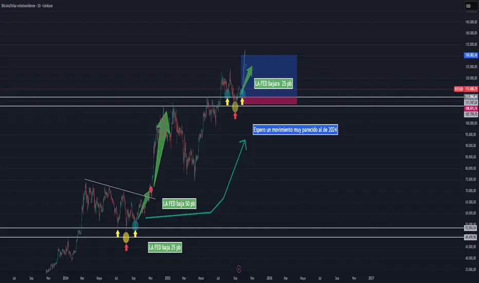 Lo que estamos observando hoy guarda similitudes notables con lo ocurrido en 2024. En aquel entonces, el inicio de las bajadas de tipos de interés por parte de la Reserva Federal marcó un punto de inflexión. Incluso un recorte moderado de 25 puntos básicos generó un repunte que coincidió con una fase de consolidación técnica en Bitcoin, en forma de canal descendente.