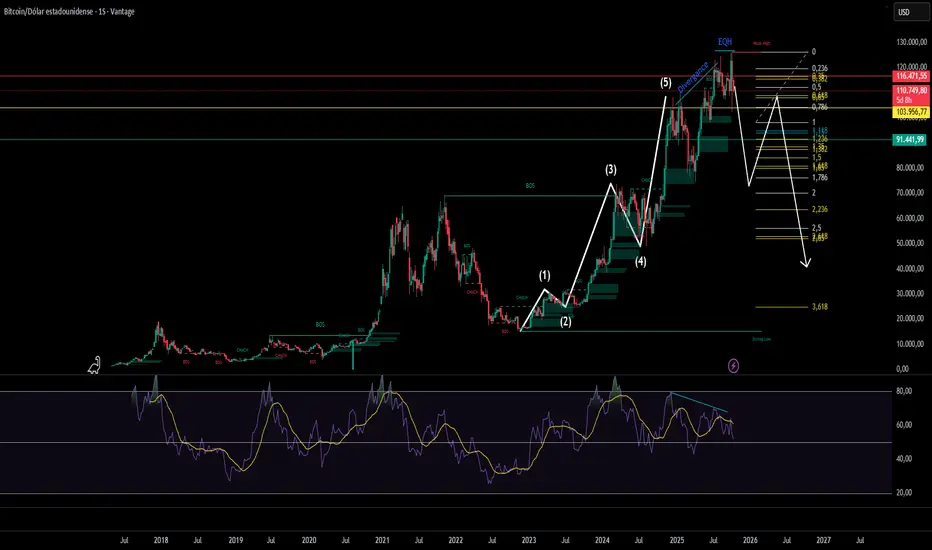 Se completó una clara onda 1-5, que terminó con una onda adicional reciente, pero sin un cierre semanal por encima del máximo/mecha de la onda 5, lo que generó una divergencia y terminó en un barrido de liquidez.