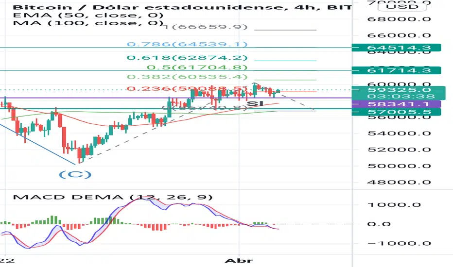 Bitcoin viene de romper una resistencia de 58341, para luego soportarse sobre este nivel y convertirlo en un soporte, viene de una onda correctiva A, B, C.