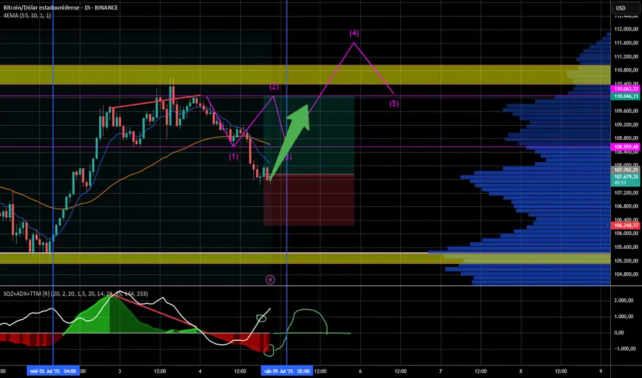 Entrada debido a adx con pendiente a medio giro, monitor sqz en mitad de valle rojo, precio tcando la media movil de 55 perdiodos( en 4hrs), esto significa cuando menos un rebote alcista la la media movil en 1hr pero espero que pueda romperla hacia arriba y llegar a rozar los 109mil dlls