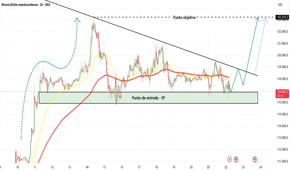 Entrada ideal alrededor de $116,500-$117,000. Rompiendo la línea de tendencia de resistencia → acercándose a la zona objetivo de $123,233.