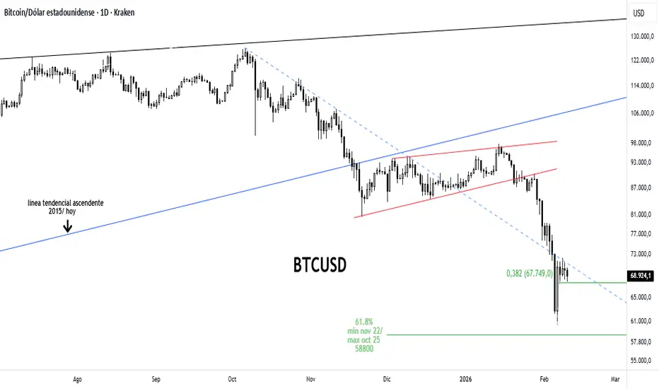 El soporte extremo apuntado unos pocos días atrás( ver informe adjunto ) fue prácticamente alcanzado tras el ultimo gran resbalón de esta criptomoneda, situación que vengo señalando desde hace tiempo. Eso quiere decir, que desde los 60000, la misma reacciono de manera importante, aunque aun nimia si uno tiene en cuenta que cayo desde su máximo un escalofriante 50 %. Actualmente se ha topado con la 1era resistencia a tener en cuenta, me refiero a la tendencial declinante originada en su máximo y que detallo en la grafica , la cual desde superarse en términos base cierre por parte de los bulls si estos pretenden ir por un nivel mas alto. Mientras no lo consigan, no deberían descartarse recortes, siendo su 1er soporte la cota en torno a los 67000/67500 ptos, una zona que sus tenedores deben defender en términos base cierre , si pretenden evitar renovadas mermas. Tenelo en cuenta.