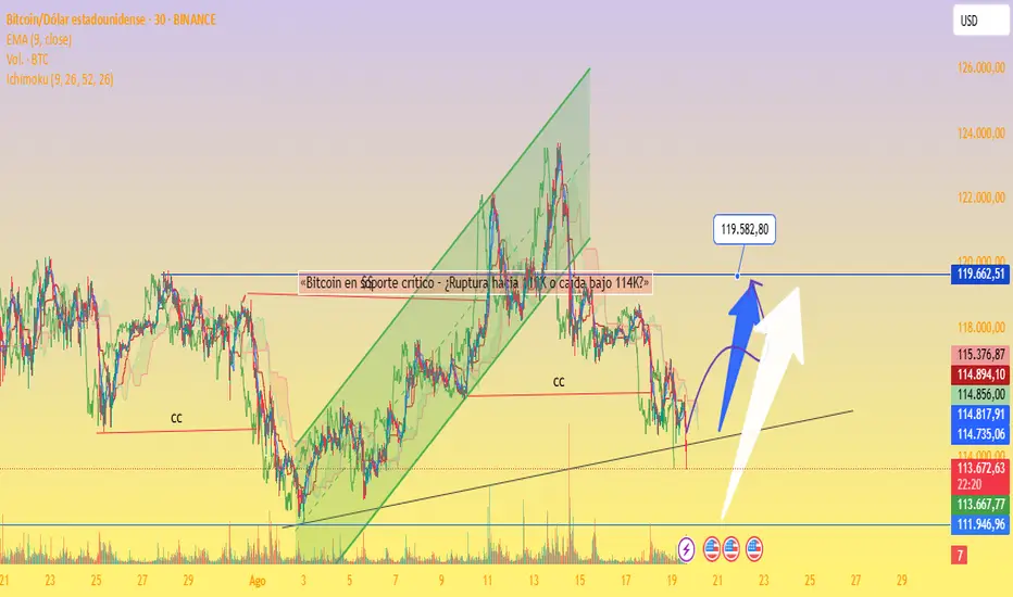 Alcista (flechas azul/blanca): Si BTC se mantiene por encima de 114,000 $ y rompe los 115,500 $, podría subir hacia 119,500 $+.