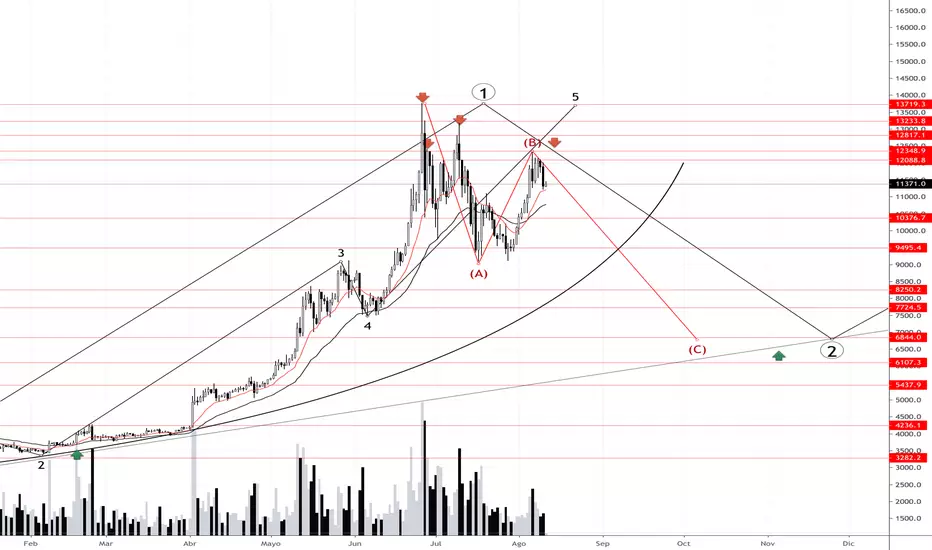 Hola buenos días estoy actualizando mi gráfica que salio el 27 de Junio, en este momento estamos en el comienzo de la bajada de la Onda C del retroceso de la ONDA 1 a la ONDA 2 del nuevo ciclo impulsivo.