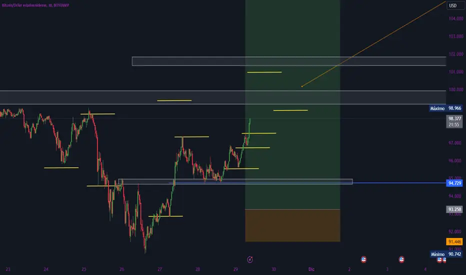 Solo siguiendo estructura y fases que hacen los mercados en repeticion, estoy esperando el cierre de BTC EN 100,000 en las proximas 12 hrs , y de ahi esperar un pequeno pullback de liquidacion de fin de semana o seguir con buen volumen a 105,000 ..