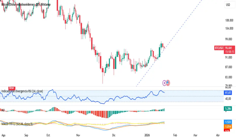 Bitcoin cotiza alrededor de 95.000 USD y respeta una línea de tendencia alcista desde los mínimos de diciembre.