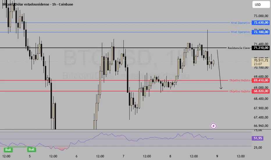 Un rompimiento claro por encima de 71210 invalidaría este escenario, habilitando un movimiento de recuperación con objetivos en 72100 y 72630.