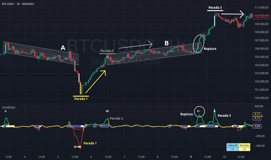 Este análisis se basa en un único ejemplo extraído del gráfico de BTC/USDC en temporalidad de 1 hora. El caso fue tomado directamente del ejemplo que aparece en la descripción del indicador Angular Volatility, aunque en esta ocasión se utilizó un activo distinto. Como BTC/USDC tiene un comportamiento de volumen diferente al par BTC/USDT, se observan variaciones en los colores de los picos, aunque los eventos técnicos observados mantienen su equivalencia estructural.
