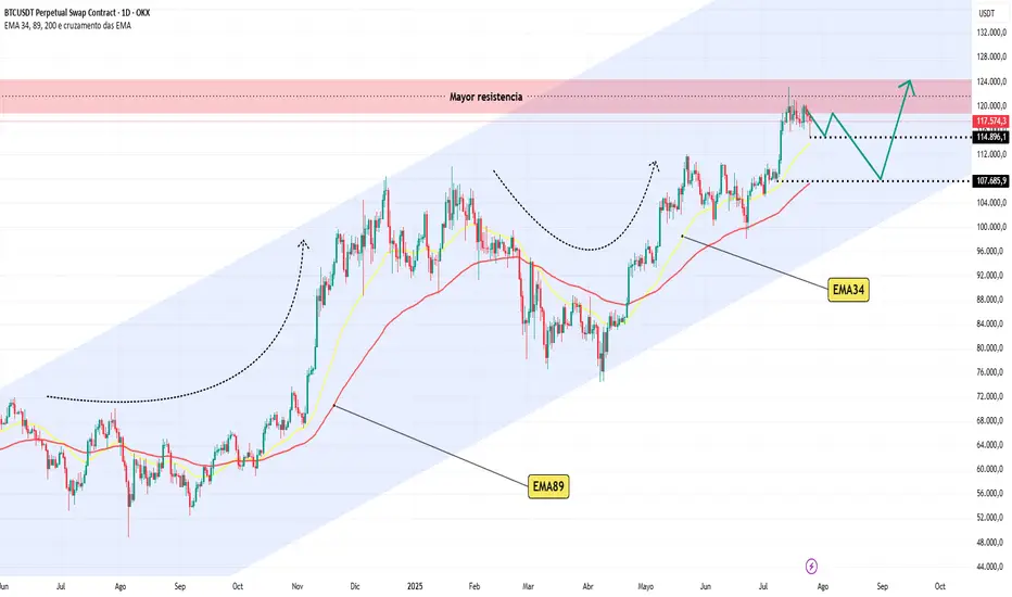 Desde el punto de vista técnico, BTC está probando una zona de soporte dinámico entre 112,000 y 114,000 USDT, donde se cruzan las medias móviles EMA34 y EMA89. El precio sigue dentro de un canal ascendente que lleva más de 10 meses, lo que indica que la estructura alcista aún se mantiene.