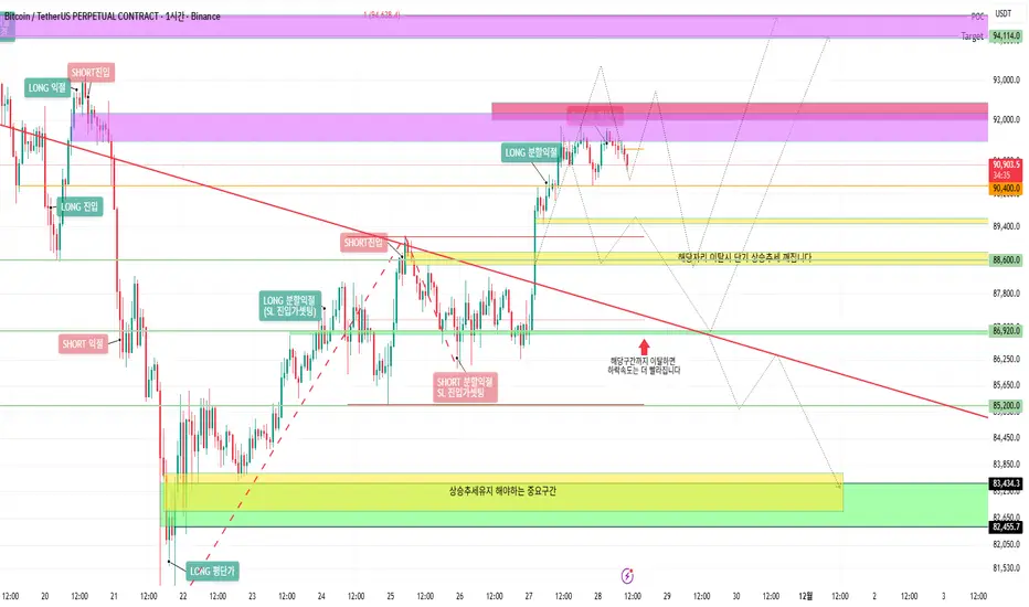 베스트 시나리오로 보이는건 89.5K 까지 하락을 주었다 92.9K - 94K 부근까지 반등 그리고 큰 눌림이 나오는게 베스트입니다