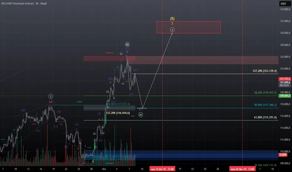 Comparto mi idea, ultima correccion como onda 4 de 5 de 5 mayor, espero caida a los 117.5 maximo 116k, para ir a buscar un nuevo ath que serian los 130k aprox para finalizar el ciclo que lo tengo marcado como posible finalizacion mediados de octubre, principios de noviembre. El bear market esta proximo a llegar y nos esperan luego 365 dias aprox de correccion, una vez que confirme proyectare los precios a los cuales podria caer en el siguiente. Lo que esta claro es que ACA YA NO HAY MAS NADA PARA HACER, solo operaciones en trading FUTUROS, dca SE VENDE EN 130 aprox, aunque los 126k no era mal punto de venta... quien sabe quizas el ciclo ya acabo jajaj