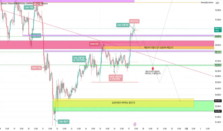 눌림이 나오더라도 빨간색 리테스트 자리에서 지지받고 위 91.4K 까지는 보라색 박스 위까지는 상승이 나올 수 있다고 보고있습니다.