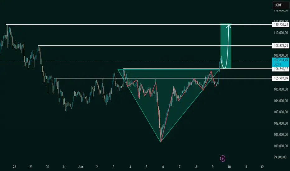 Actualmente, el precio ha superado la línea de cuello, alcanzando niveles alrededor de 107.586,58 USDT, lo que valida la ruptura del patrón HCHi. Esta ruptura está respaldada por un fuerte impulso alcista que refleja: