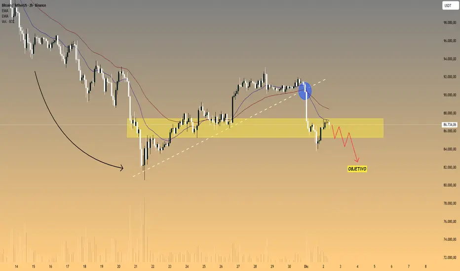 BTC rompió la línea de tendencia ascendente y no pudo volver a realizar la prueba en el arco superior (círculo azul). EMA20-EMA50 se amplió en una estructura bajista, lo que confirma que el impulso se inclina hacia los vendedores. La actual zona amarilla es solo una zona de recuperación técnica después de una fuerte ruptura.