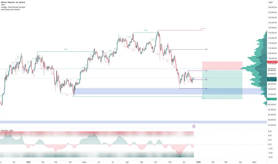 Sesgo General: Bajista en el Corto Plazo / Correctivo Aunque la tendencia macro (Semanal) es alcista, el gráfico Diario muestra una estructura de mercado bajista activa con etiquetas claras de BOS (Break of Structure) en rojo a la baja. El precio está actualmente en una fase de "Retroceso Complejo" (Pullback) hacia zonas Premium para buscar liquidez antes de continuar la caída hacia la zona de demanda mayor.