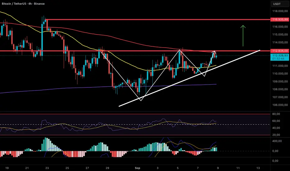 Bitcoin zeigt auf dem 4h-Chart derzeit ein klares Ascending Triangle, das sich direkt unter der roten Widerstandslinie sowie der 200er EMA formiert. Bereits drei Mal wurde der Kurs in diesem Bereich heftig abgewiesen, dennoch gelingt es ihm immer wieder, dorthin zurückzukehren – ein Hinweis auf zunehmenden Kaufdruck.