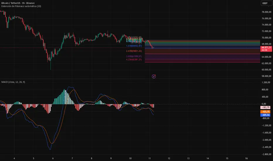 El gráfico muestra una continuación bajista. El precio está buscando soporte y el MACD no muestra divergencias alcistas todavía. La zona de los $66,600 es crítica; si se mantiene por debajo, es muy probable que visite los $65,000 en las próximas en las próximas horas.