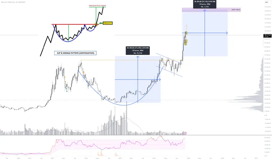 En HTF (High Time Frame) Bitcoin sigue confirmando el patrón de Cup & Handle, en el gráfico semanal, que al menos debería de llevar a