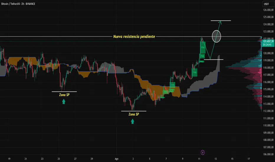 En el marco de 2H, BTC mantiene una tendencia alcista desde el mínimo del 3/8, formando y llenando de manera constante zonas FVG, con el precio por encima de la nube Kumo (Ichimoku) y conservando una estructura de higher-lows.