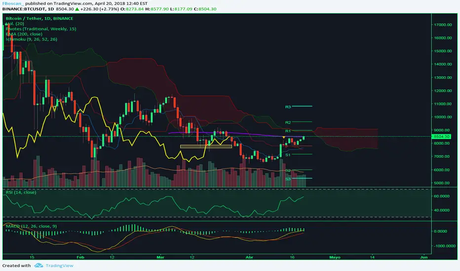 Continuando con el análisis, otra confirmación, la cual es la mas clara hasta el momento, nos la da el punto de pivotes de la semana. Este no solo fue superado por el precio, si no que ademas ha servido de soporte, lo cual consolidó el rally en el cual se encuentra actualmente el mercado. Asimismo, otra señal importante es el cruce de los senkou span (linea roja y azul), esto indica que el mercado esta entrando en un rally (al menos en corto plazo). También, como última señal, observamos que el precio se encuentra luchando con la EMA de 200 periodos, de superarla el siguiente obstáculo sería la R1 de la semana, la cual curiosamente se encuentra justo encima de la parte mas angosta de la nube de ichimoku. Este es el punto decisivo que podría marcar el fin de la corrección. Sin embargo, habría que esperar un patrón fuerte que indique el fin definitivo dela corrección.