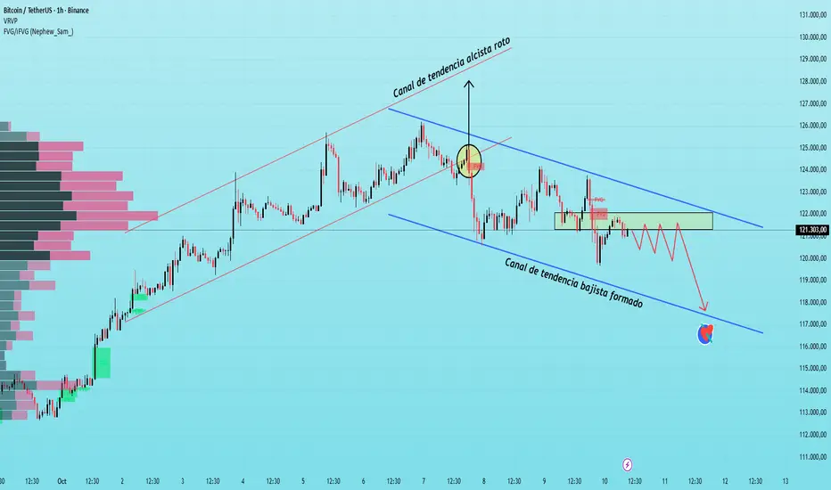 Bitcoin está entrando en una fase de corrección a corto plazo tras romper el canal principal de tendencia alcista formado a principios de mes. En el gráfico H1, el precio ha formado un claro canal bajista con picos inferiores y zonas FVG consecutivas, lo que indica que la presión de venta se mantiene.