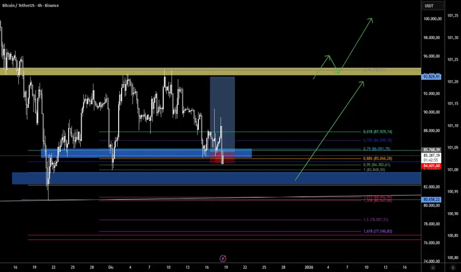 La formacion de liquidez en la zona de los 84K asi como el precio rebotando sin fuerza en el ultimo nivel que tengo en mis analisis (95%), y tomando en cuenta que se viene fin de semana ya con vaciones la puerta me hace suponer que el precio quiera caer a la zona inferior azul en la zonas de 82-83 k ahi nuevamente buscaria compras sostenidas hasta los 94 K. El ultimo rebote lo buscaria en los 81K. El movimiento queda invalidado si rompemos a la baja la zona de los 80K, reevaluariamos los nuevo escenarios. Saludos