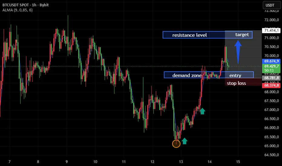1️⃣ Zona de demanda respetada (≈ 68,700 – 69,000)