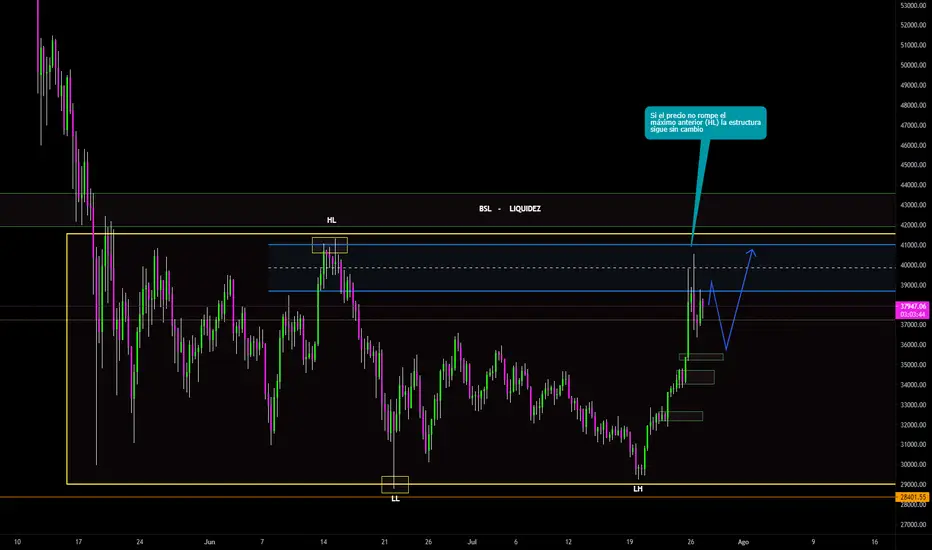 En este momento el mercado NO ha reflejado un cambio de estructura, mientras no rompamos el último máximo. Para los swing traders, es necesario esperar este cambio de estructura y un retroceso, porque es un suicidio entrar en posiciones largas de más tiempo, cuando ya estamos en la parte alta del mismo rango de precios señalado con el rectángulo amarillo y que tenemos los impulsos completos en menor timeframe. Tenemos que esperar retrocesos y buscar un buen precio de entrada como 'trade'.