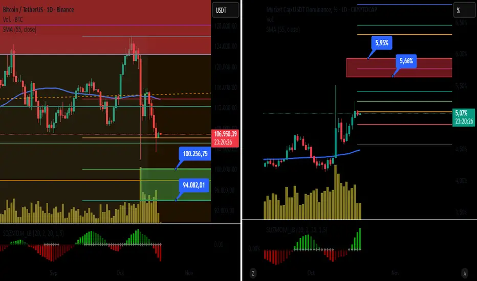 En un enfrentamiento entre BTC y la dominancia de USDT, yo lo haría así: dominancia llega a la zona roja y btc llega abajo a la zona verde, entro en long.