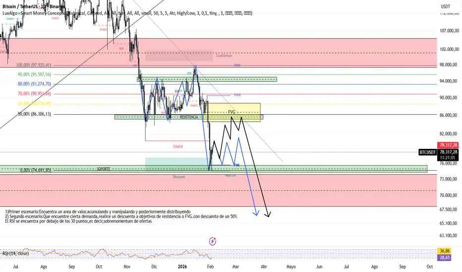 2)El segundo es un descuento mas agresivo,volviendo a testear zonas de resistencias o FVG con un descuento de un 50%-60% tocando nuevamente los 90k,si es verdad que es un escenario para un poco menos probable,en donde vemos ventas masivas en los ETF,pero puede encontar la suficiente demanda para testear nuevamente esos precios.