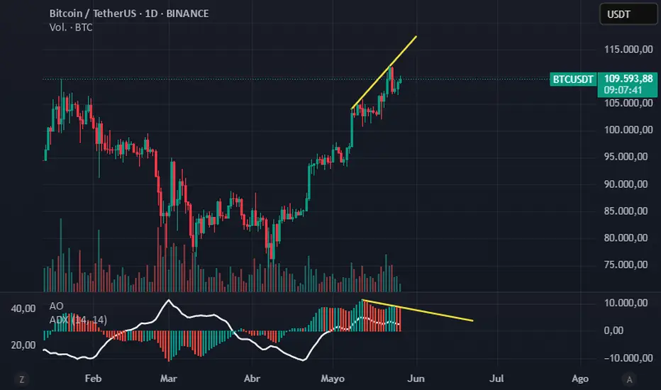 Comenzamos la semana con una divergencia en grafico diario bajista, del oscilador asombroso con relacion al precio, GRAFICO DIARIO - TEMPORALIDAD QUE SE RESPETA SI O SI, no es un grafico de 1 hora... ABRO SHORT X10 EN 109700...