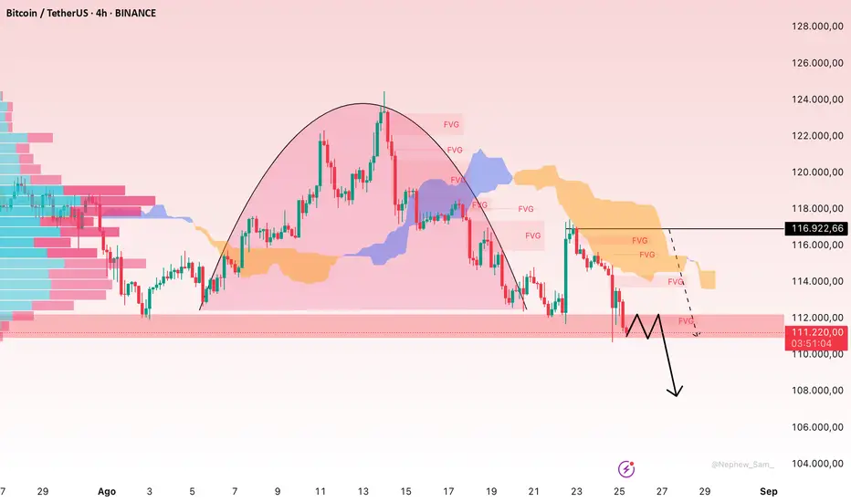 El gráfico de 4H muestra un BTC atrapado bajo la nube Ichimoku, encadenando máximos y mínimos descendentes. Las zonas de oferta en 113,8–114,6k y 115–116k han neutralizado cada intento de rebote, dejando a los vendedores con el control. Por abajo, el soporte en 111,7–111,0k todavía no ha sido validado, lo que lo convierte en un imán potencial para el precio.