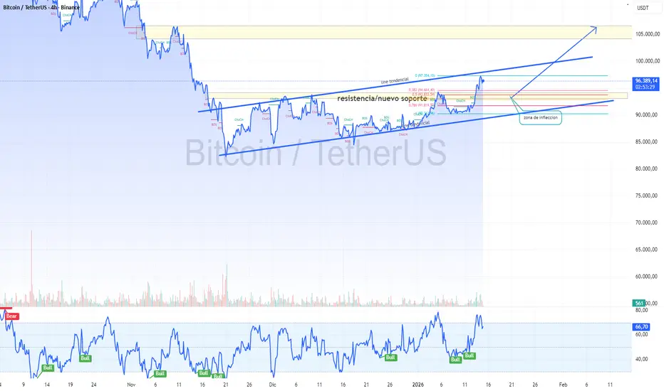 explicando el breve resumen del día 14 de enero 2026. después de que el precio nos asegurara mas caídas ,hizo lo contrario ,estos movimientos son sanos ,ya que la decisión de institucionales levantaron el precio cerca de los 98mil ,para estos próximos día estaremos analizando una confirmación clara en la zona de antes resistencia y ahora soporte ,ya que la ruptura de esta zona de consolidación fue clara es posible que ahora los compradores dominen esta tendencia llevando el precio en este año 2026 a máximos históricos ,si te gusta este tipo de gráficos sigue apoyando nuestras ideas para brindarte mas análisis como estos.