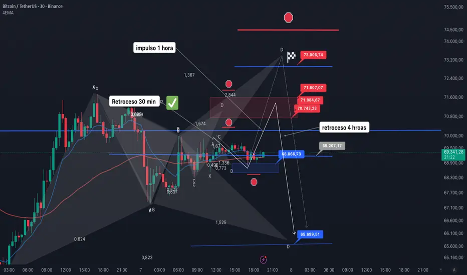 Si no logra el impulso de 1 hora y 4 horas superar los 70250 y tiene su desarrollo completo a 1 hora y 4 horas entraremos a la baja en precios mas bajos, por el momento se mantiene idea de solo volver a entrar arriba de 70250 hasta 73000