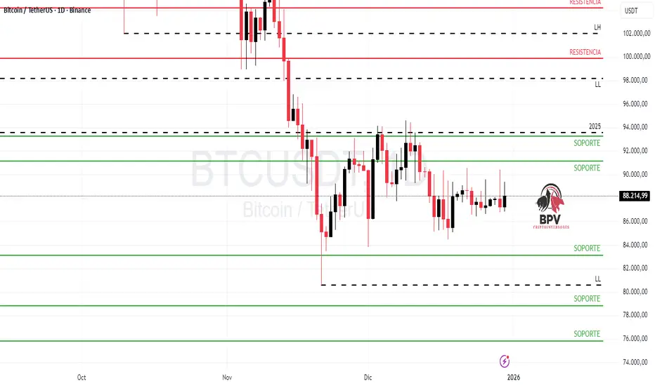 BTCUSDT ) continúa encasillado en un rango bien definido entre los USD 85,000 y USD 90,000, sin lograr aún una ruptura clara. Desde el punto de vista técnico, este comportamiento refleja compresión de volatilidad, una fase que históricamente suele anteceder movimientos direccionales relevantes.