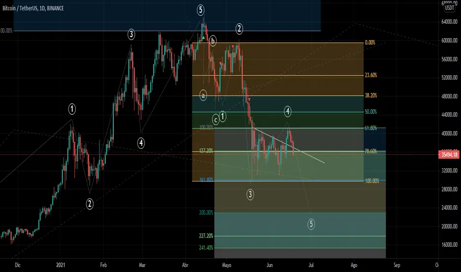 Seguimos dentro de la 5ta onda correctiva, target estimado en los 23mil dólares ... pudo haber invalidado el conteo pero el número áureo aguanto el embiste de los toros..