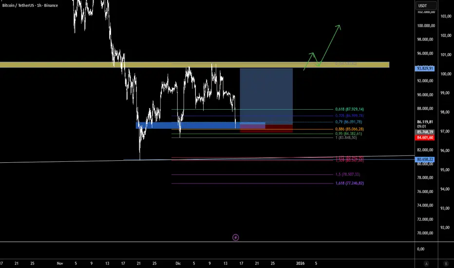 hemos notado que la zona de los 94k se ha comportado como una resistencia bastante solida que el precio no ha podido romper. De momento estariamos buscando una compra en la zona marcada de azul porque tenemos buena confluencia con nivels de oferta y demanda, asi como un buen nivel de fibonacci (88.6) para marcar un nuevo impulso e ir por esa resistencia.
