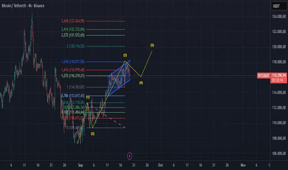 Despues de terminar la onda 3 en el 1.68 de Fibonacci, btc esta corrigiendo con la onda 4 y un canal con soportes que viene respetando.