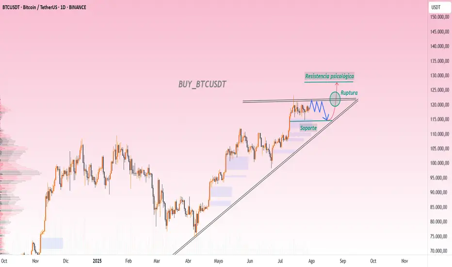 Bitcoin está formando un patrón de triángulo ascendente en el marco diario (D1), con la línea de tendencia alcista actuando como un fuerte soporte cerca del nivel de 114,451 USDT. Actualmente, el precio se encuentra consolidando justo debajo de la resistencia psicológica en 127,868 USDT. Si logra romper esta zona, el impulso alcista podría intensificarse.