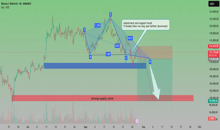 El gráfico muestra que Bitcoin (BTCUSDT) está formando un patrón armónico que sugiere una posible continuación bajista. Actualmente, el precio está probando un nivel clave de soporte y resistencia en la zona de 113,000–114,000. Si este nivel no se mantiene, podríamos ver una mayor caída.