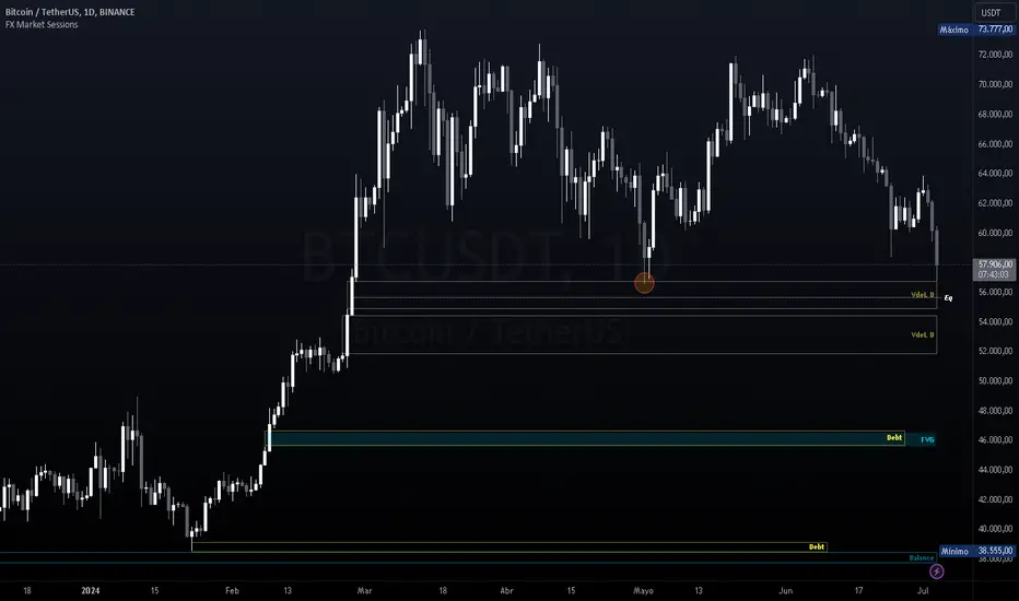 BTC se aproxima a una zona de equilibrio donde podríamos ver un repunte del pecio, sin embargo la deuda se centra en zonas mas bajas del gráfico, simplemente para cumplir un ciclo completo, debería trasladarse hasta esas zonas y liquidarlas.
