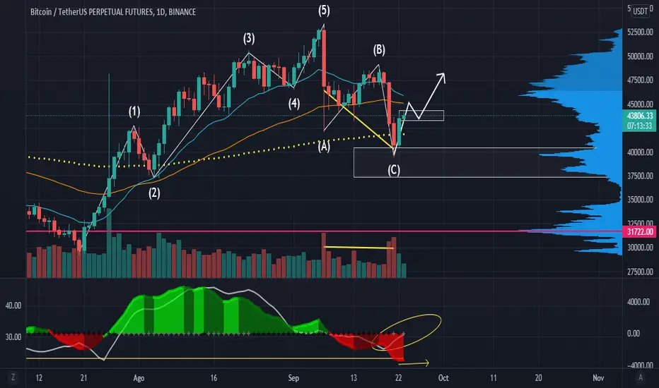 BTC 1D. Precio llego a zona de soporte importante y tuvo su reacción correspondiente alcista, ahora bien allí donde esta ahora ya cumple los parámetros de una onda impulsiva alcista 1, así que podríamos estar en presencia de una recuperación de precio, CUIDADO SI ESTAS EN SHORT , a juzgar por el valle rojo bastante desarrollado y el hecho de que se torna horizontal, el precio respondiendo a una divergencia de volumen, un adx que aunque tiene aun pendiente positiva da muestras de debilidad, considero que la posibilidad mas alta es que el precio se recupere en una onda 3 como señalo en el gráfico