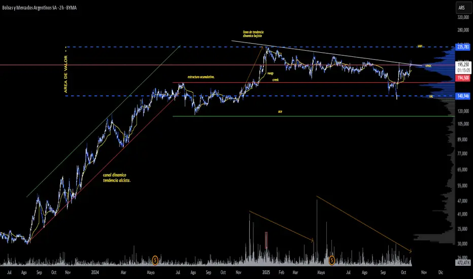 Actualmente, BYMA se encuentra reingresando al área de valor luego de un período extendido de compresión lateral y una ruptura de línea de tendencia bajista, la cual fue momentáneamente superada, pero sin lograr cierre sostenido por encima del VPOC (197.000 ARS).